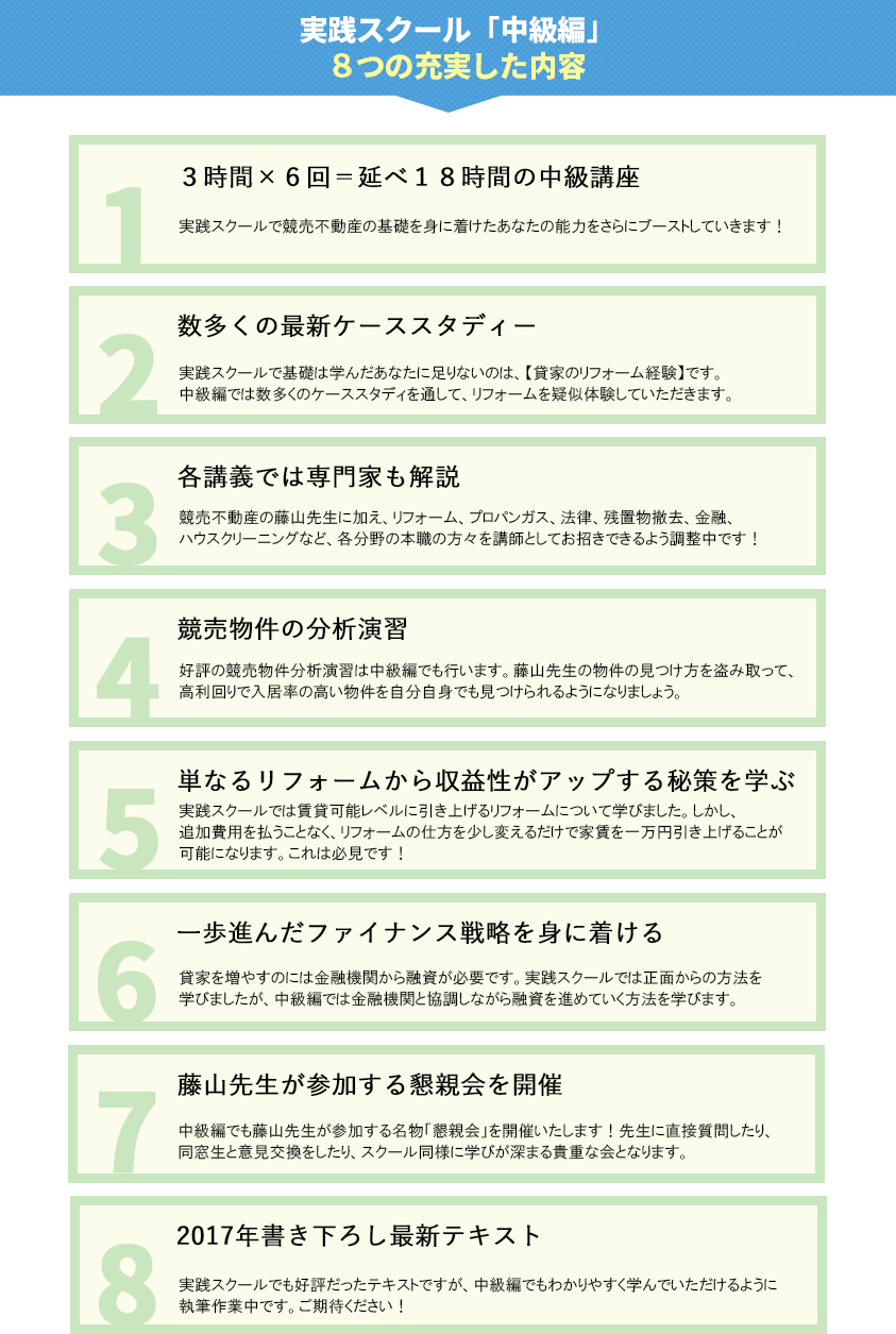 藤山先生は風貌はちょっと怖いですが(笑)お人柄はとてもやさしく、競売のやり方を丁寧に、わかりやすく教えてくれます。今後も競売を使って、不動産を増やしていきたいと思います。